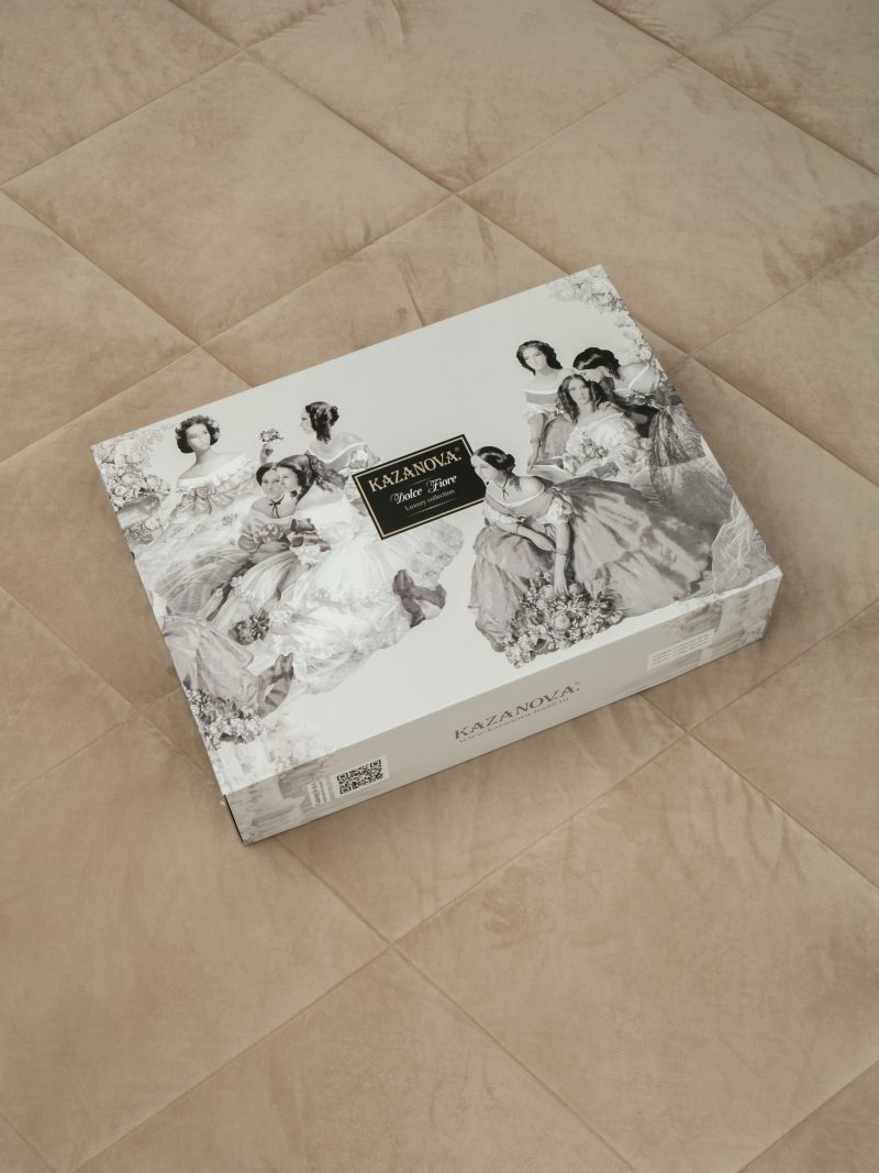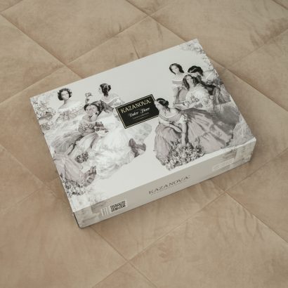 Комплекты изящно выложены в брендовую подарочную упаковку «KAZANOV.A.» с PVC ручкой.