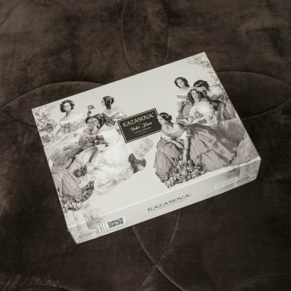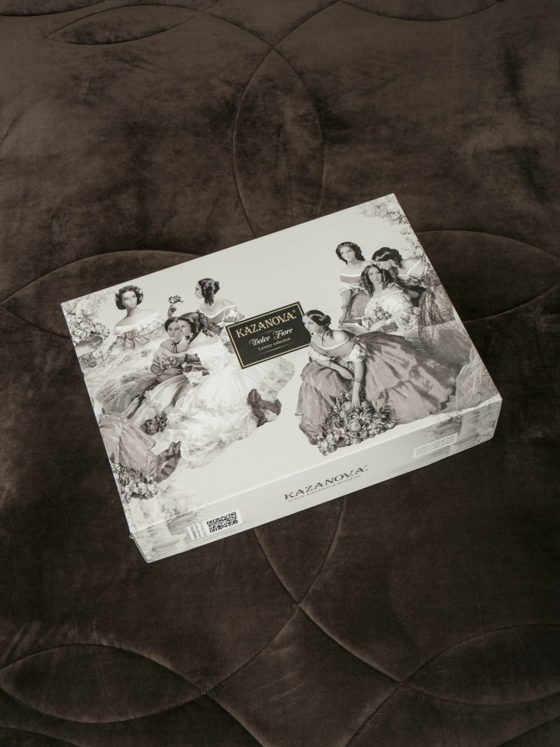 Комплекты изящно выложены в брендовую подарочную упаковку «KAZANOV.A.» с PVC ручкой.
