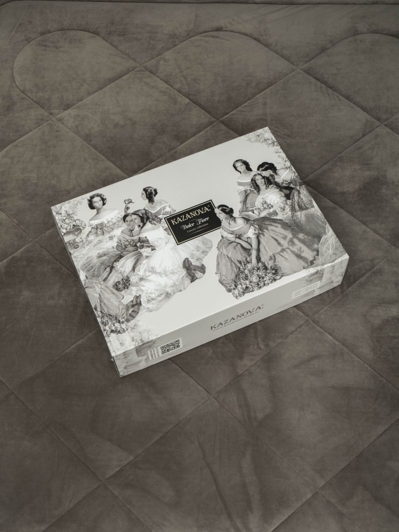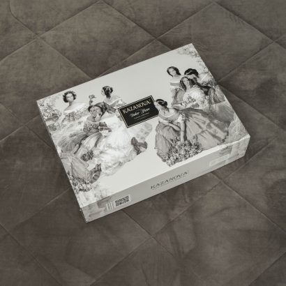 Комплекты изящно выложены в брендовую подарочную упаковку «KAZANOV.A.» с PVC ручкой.