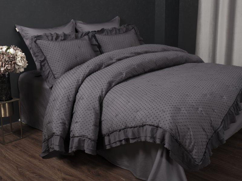 Одеяло: 200/220 см: • Точечная стёжка, • Рельефный декор — 3D-горошины, • Отделка по трём сторонам: двухъярусный необработанный волан (10 см + 7 см), • Наполнитель: Микрогель (эко-волокно).